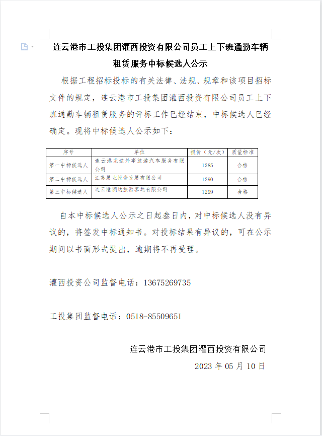 连云港市工投爱体育首页(中国)网页版灌西投资有限公司员工上下班通勤车辆租赁服务中标候选人公示