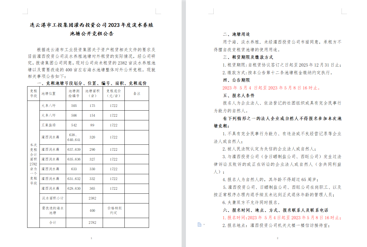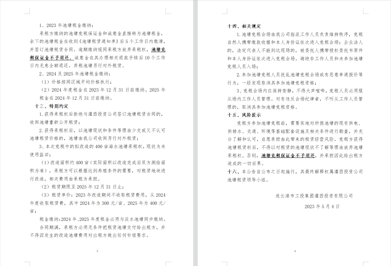 连云港市工投爱体育首页(中国)网页版灌西投资公司2023年度淡水养殖池塘公开竞租公告