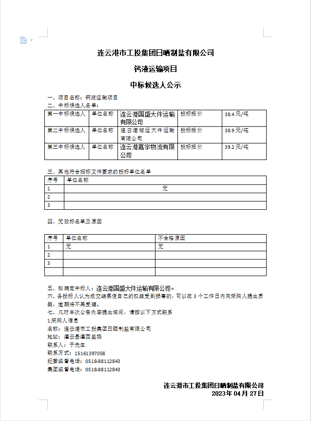 连云港市工投爱体育首页(中国)网页版日晒制盐有限公司钙液运输项目中标候选人公示