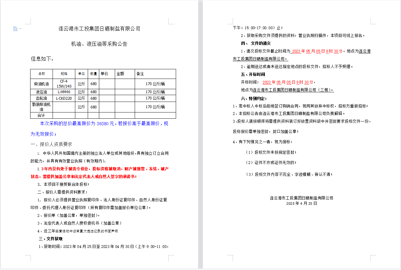连云港市工投爱体育首页(中国)网页版日晒制盐有限公司 机油、液压油等采购公告