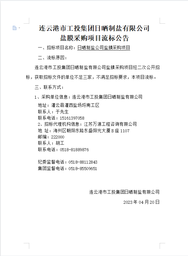 连云港市工投爱体育首页(中国)网页版日晒制盐有限公司盐膜采购项目流标公告