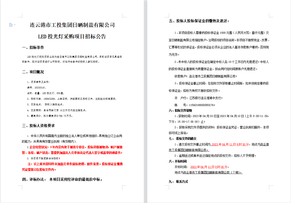 连云港市工投爱体育首页(中国)网页版日晒制盐有限公司LED投光灯采购项目招标公告