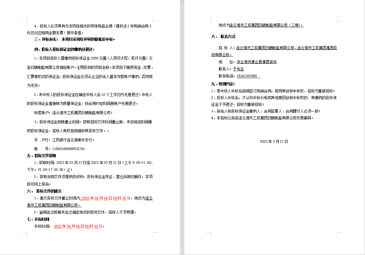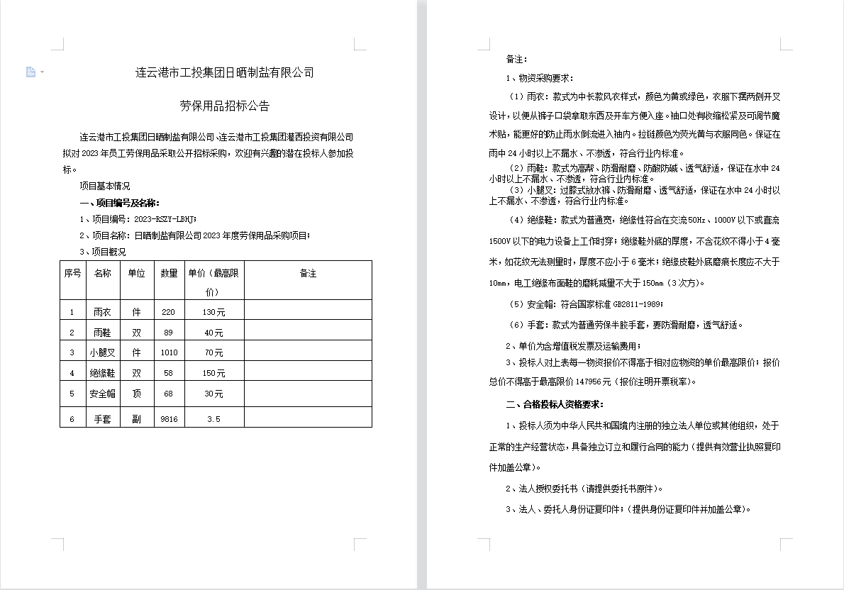连云港市工投爱体育首页(中国)网页版日晒制盐有限公司劳保用品招标公告