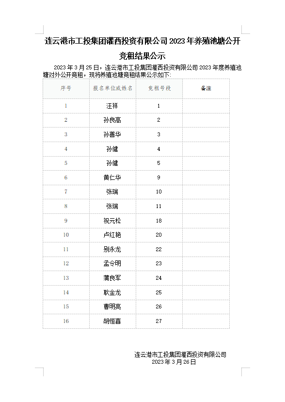 连云港市工投爱体育首页(中国)网页版灌西投资有限公司2023年养殖池塘公开竞租结果公示