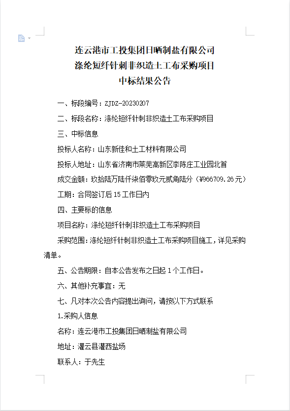 连云港市工投爱体育首页(中国)网页版日晒制盐有限公司涤纶短纤针刺非织造土工布采购项目中标结果公告
