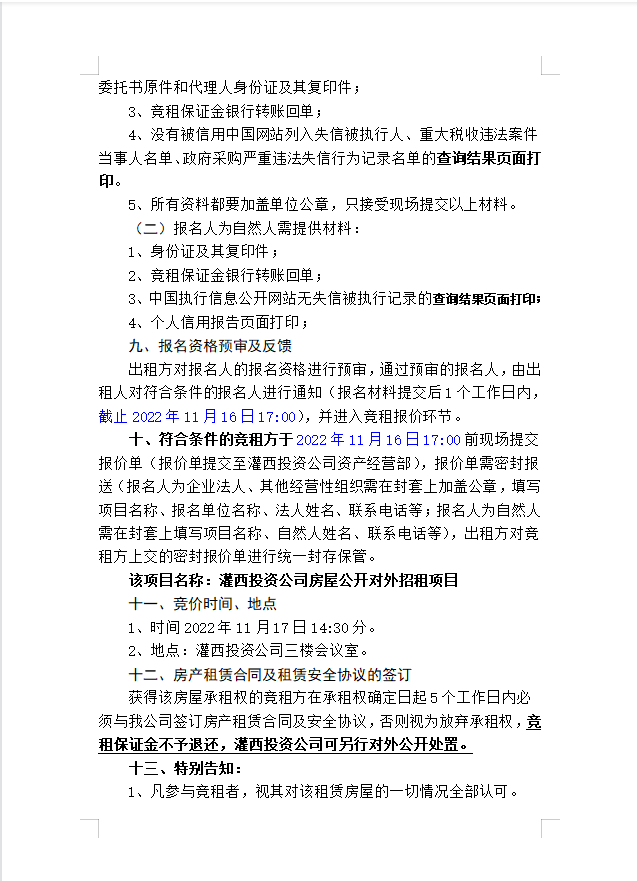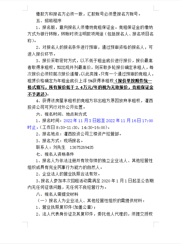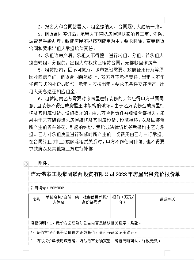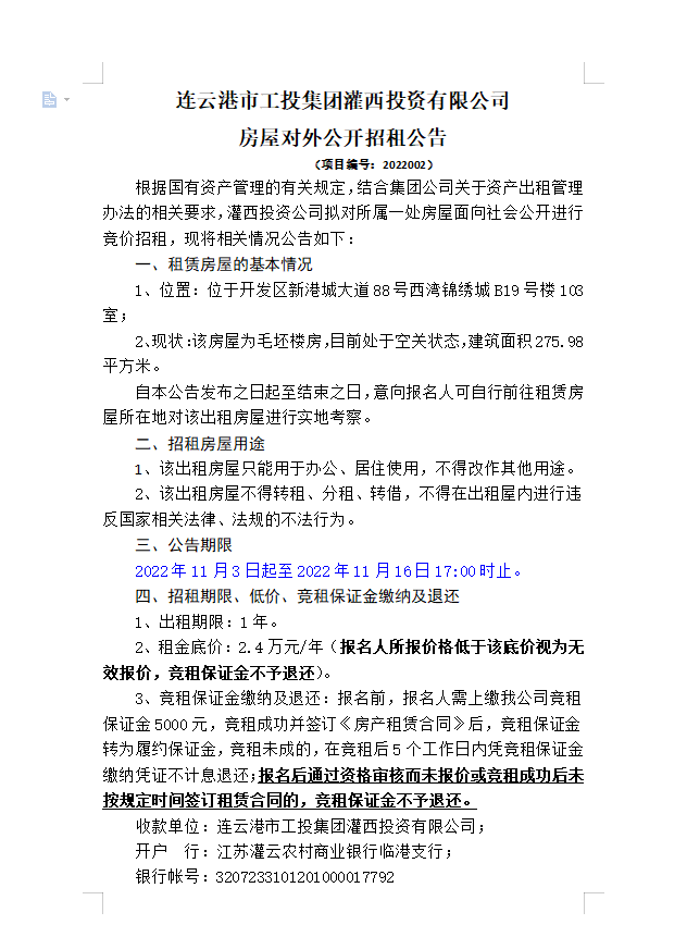 连云港市工投爱体育首页(中国)网页版灌西投资有限公司房屋对外公开招租公告