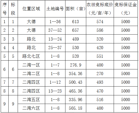 一、竞标农田标段、位置、面积、竞标底价、竞标保证金: