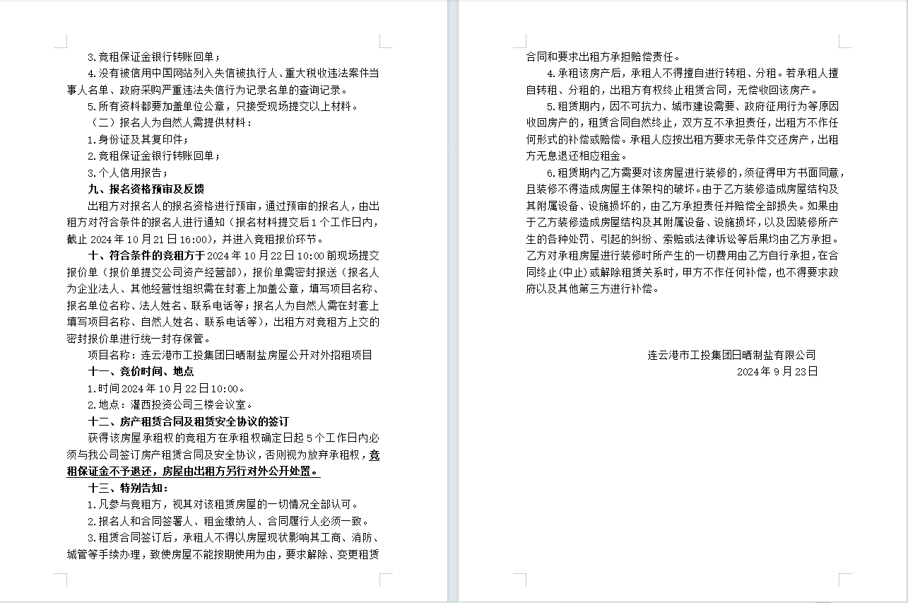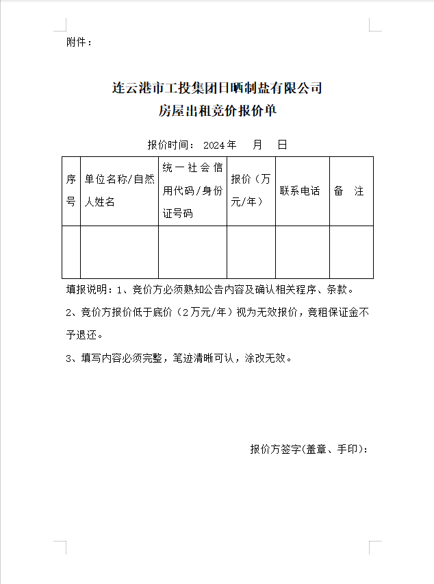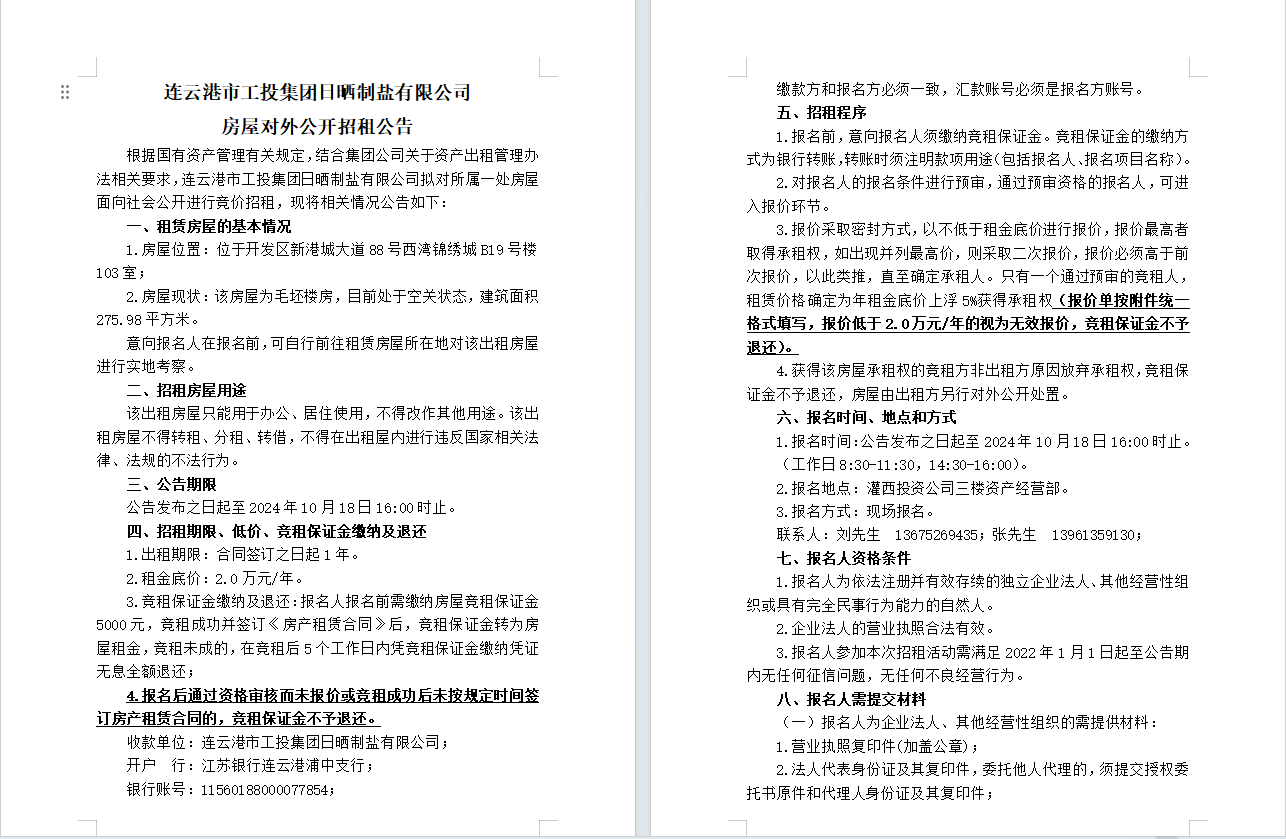 连云港市工投爱体育首页(中国)网页版日晒制盐有限公司 房屋对外公开招租公告