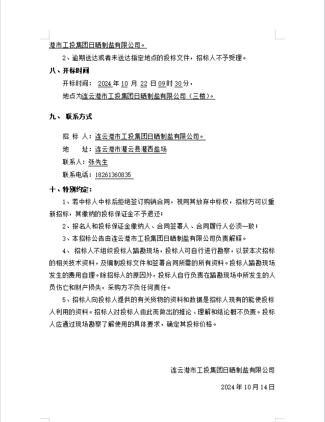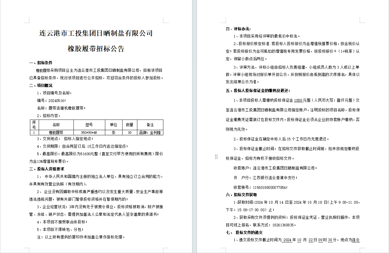 连云港市工投爱体育首页(中国)网页版日晒制盐有限公司橡胶履带招标公告