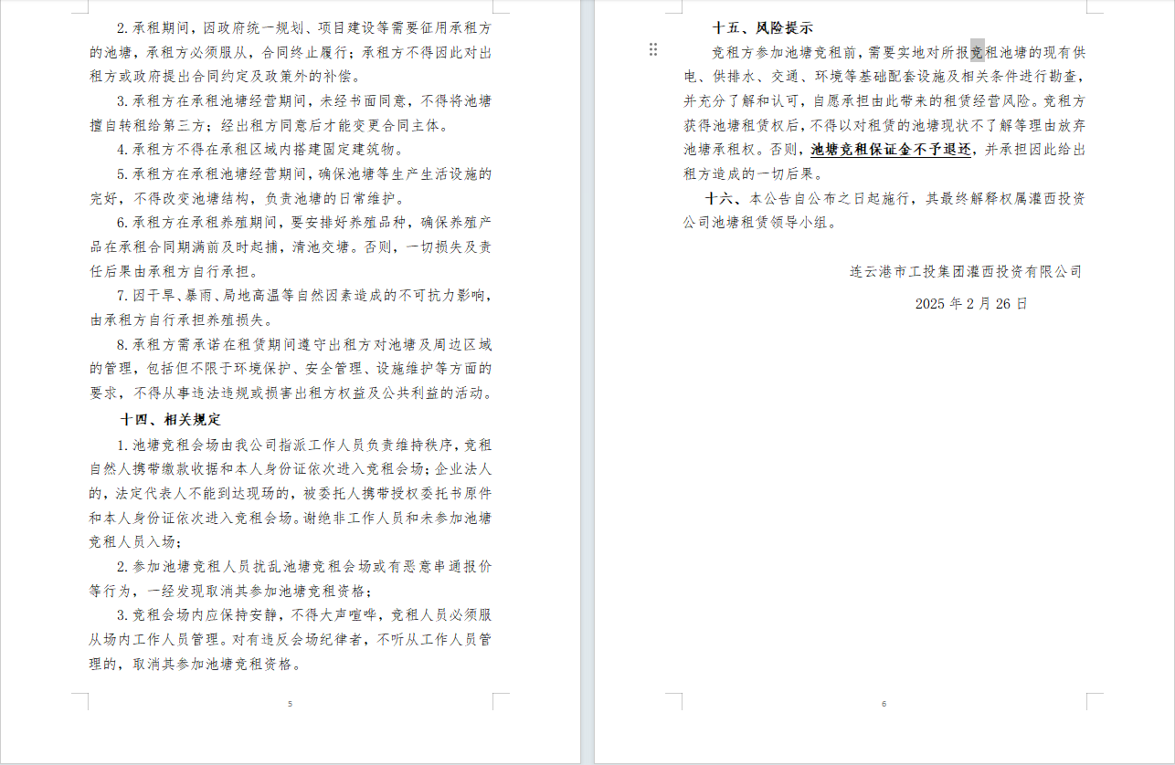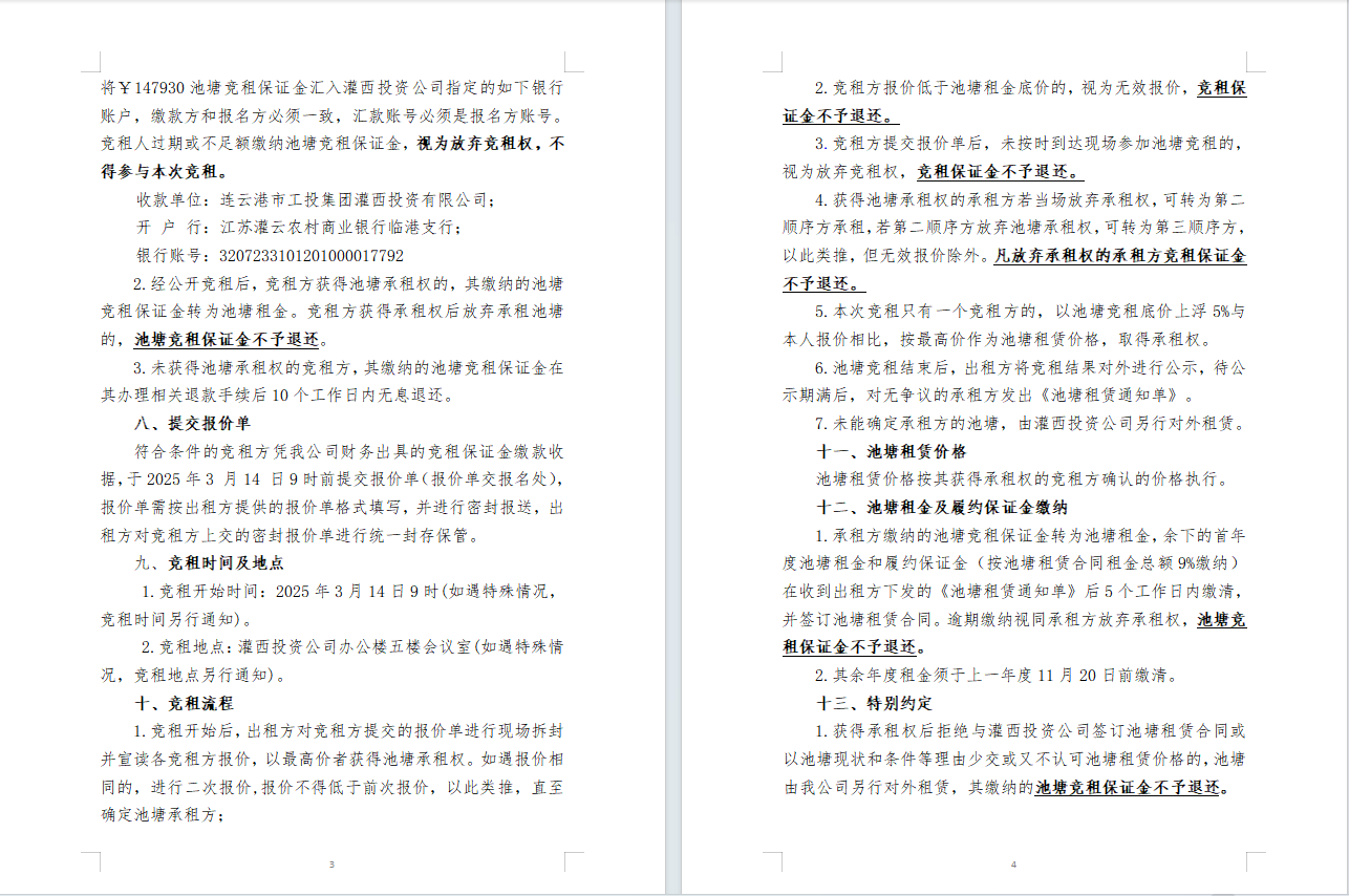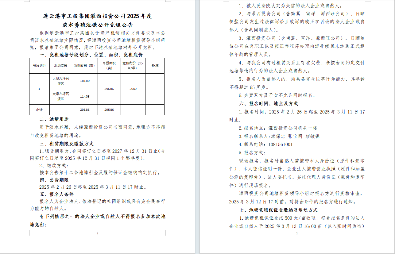 连云港市工投爱体育首页(中国)网页版灌西投资公司2025年度淡水养殖池塘公开竞租公告