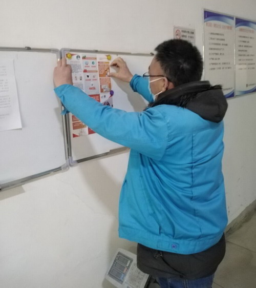 陈东在加工盐车间宣传栏张贴防疫宣传资料