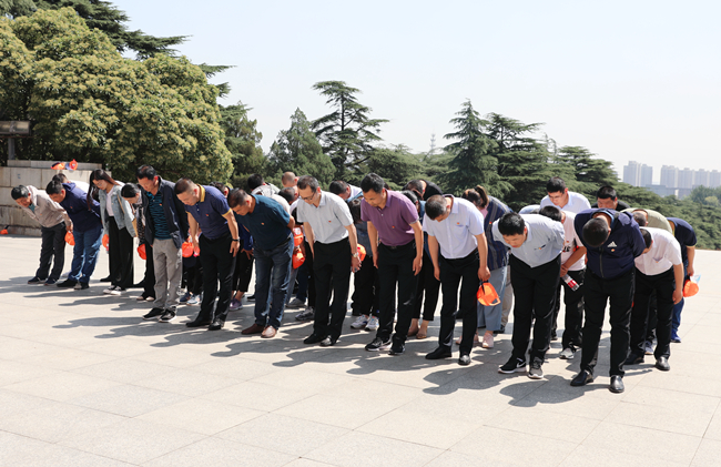 在烈士纪念塔前,公司党委副书记梁永带领全体党员向淮海战役烈士敬献花篮,并三鞠躬。