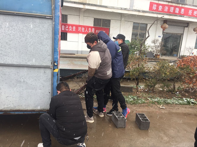 公司党委书记、董事长胡传法冒雪检查成业饲料卡口,胡书记嘱咐在现场值班的团青干部防控一线,要动真格不能含糊,坚决不给外来车辆通过。负责这里还有生产生活服务中心和黄沙分场的全体管理干部,大家都很辛苦,但没有埋怨,都在默默地坚守岗位,履行职责。“你不站岗我不站岗,谁保卫咱大场”他们是这样说也是这样做的。为了让值守人员有一个温暖的临时休憩的场所,泰祥公司将一个临时集装箱拉到卡口,后勤班的小伙子们,搬运调试固定,丝毫没有因为寒冷的天气影响工作进度。