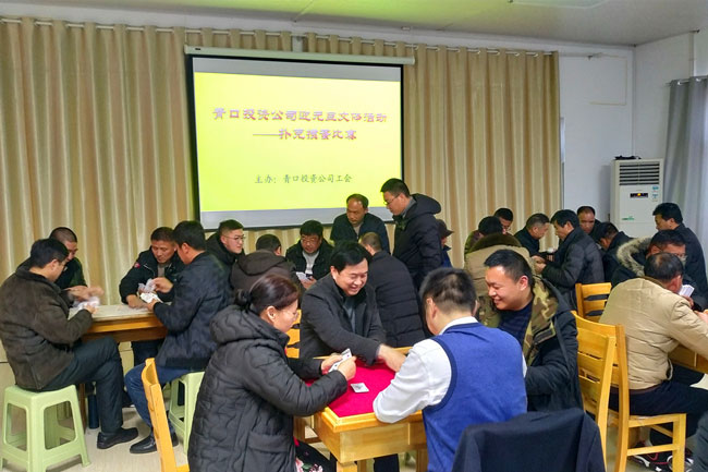 27日,在职工活动室,约50名员工参加了扑克牌掼蛋比赛。赛前选手通过抽签决定对手,采取淘汰赛方法进行。比赛中参赛选手聚精会神、密切配合、精确计算、谨慎出牌。对阵双方比牌技、比智慧、赛成绩、赛友谊。每一局比赛结束,不时传出参赛选手懊悔和兴奋的唏嘘声,也有旁观者赞叹和惋惜的评价,比赛就在这样时而紧张、时而热烈的气氛中进行。经过激烈、公平、公正的角逐,黄沙分场代表队的刘英军、李召田获得冠军,米业营销的的严鑫、葛苏获得亚军。