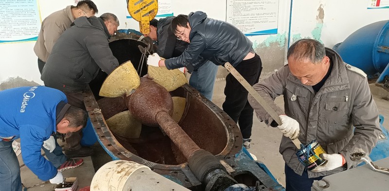 随着天气渐冷,为维护扬水站机械设备的精度和性能,延长设备使用寿命,近日,生产生活服务中心扬水站班组加班加点对机房内所有水泵进行大修保养。