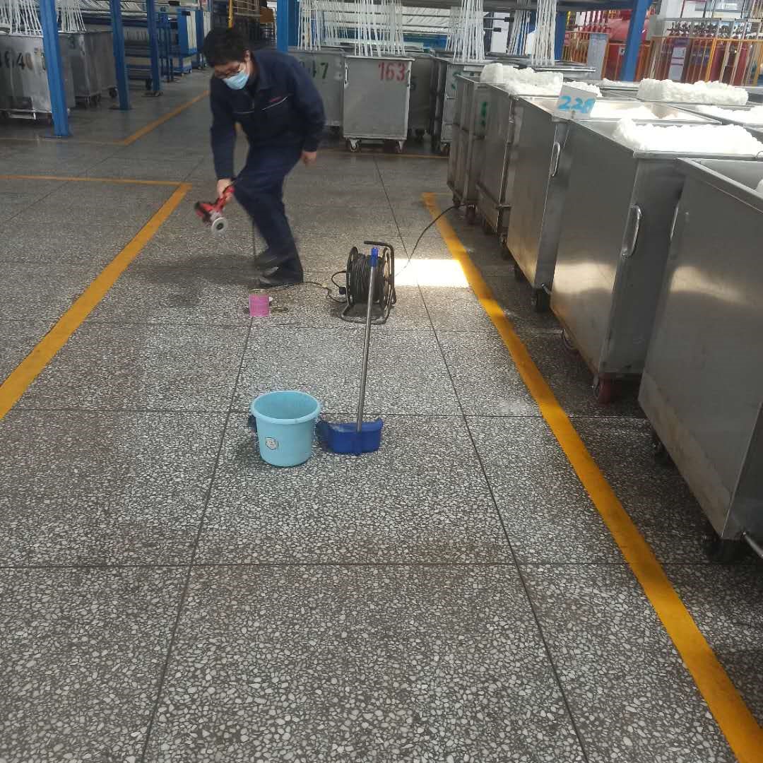 为解决生产车间地表面磨损严重及地表面黑化等问题,418日中午,生产车间甲班大班长党晓峰使用手持式打磨机,对生产车间后纺集束空地小块区域,进行了打磨加石板蜡抛光实验。若实验效果良好,可进行全车间使用,改善地面油渍黑化现状,美化生产环境。