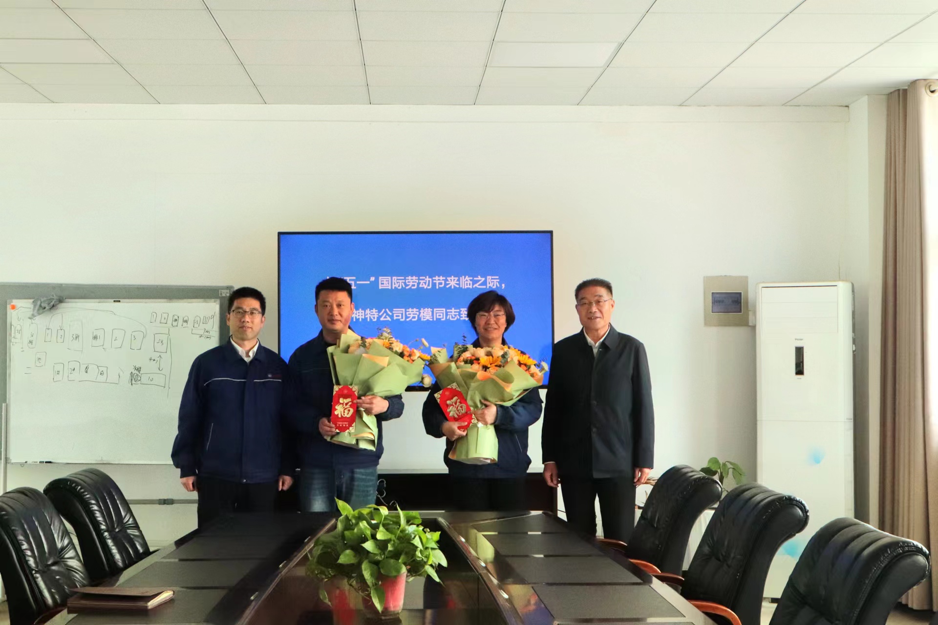 刘总与两名市劳模面对面交流,倾听他们的心声和意见,感谢他们长期以来为企业发展作出的贡献,并献上一束鲜花、送上一份慰问、表达一段祝福。
