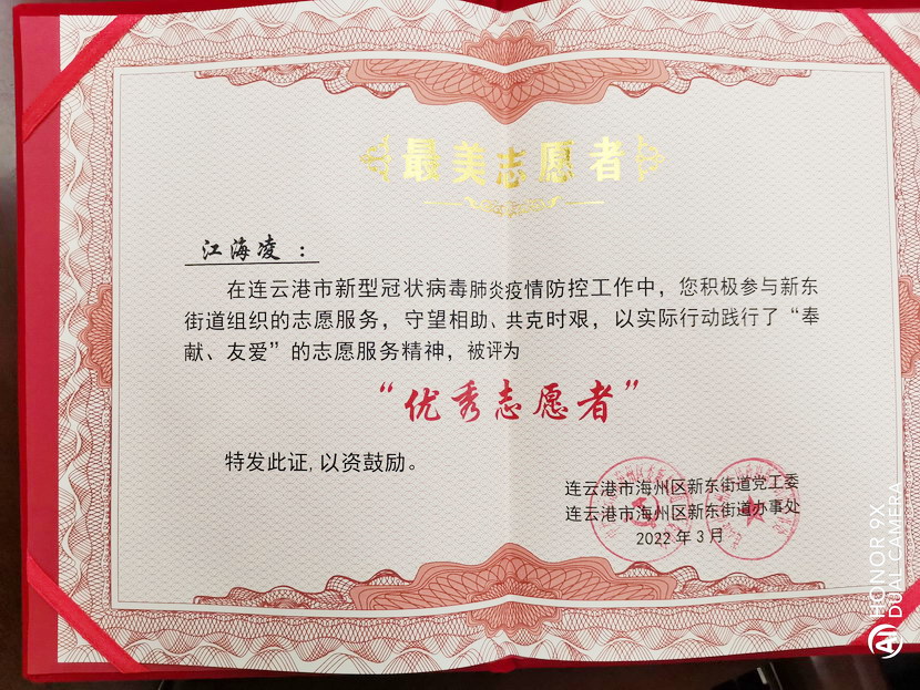 新东街道党工委、新东街道办事处联合为荣誉获得者颁发纪念证书,同时予以表扬,新东街道提到:市工投爱体育首页(中国)网页版台北投资公司党员江海凌同志最肯吃苦,最能战斗。他每天早上到的比谁都早,晚上回的比谁都晚,与社区工作人员一道进楼入户排查信息,仔细询问居民生活物品需求情况并予以解决,还认真参与卡点防控值守、小区巡逻、做好小区出入人员体温检测、登记消杀出入车辆等一线工作。在疫情最后阶段,大部分志愿者撤离,江海凌仍在“逆行”,成为小区居民物资保障志愿者,每天为广大居民“菜篮子”保驾护航,江海凌是勇于担当的逆行者,是最美志愿者。