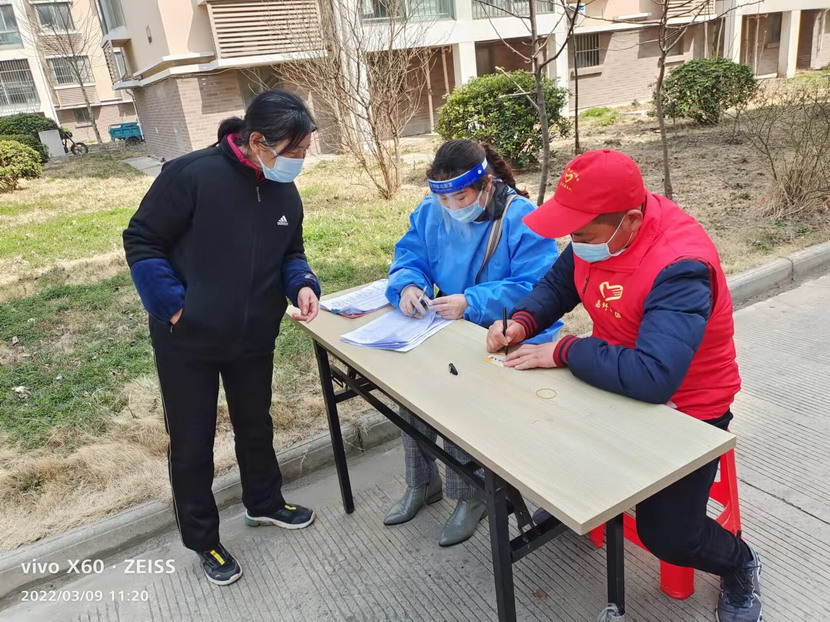 ▲海州公司党支部副书记苏玲与职工邱荣斌等进行核酸检测登记
