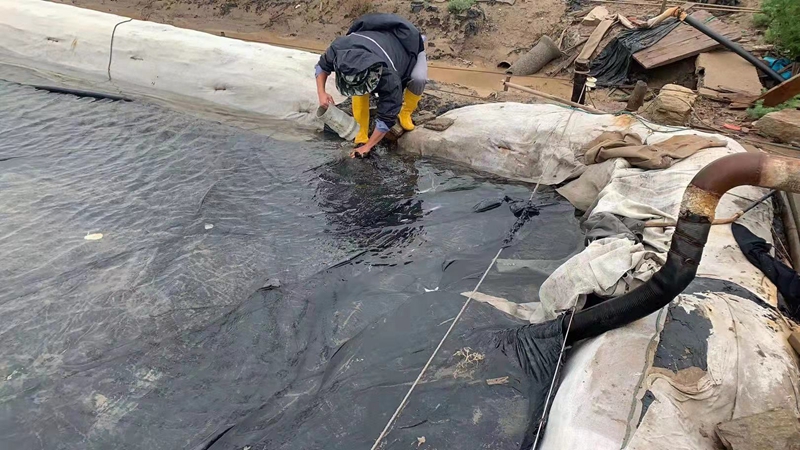 钙液复晒滩上,为了做好雨后的排涝工作,保障钙液池中的成品钙液的正常存储和销售。钙液储备组成员踩着泥泞,第一时间进行排涝操作。