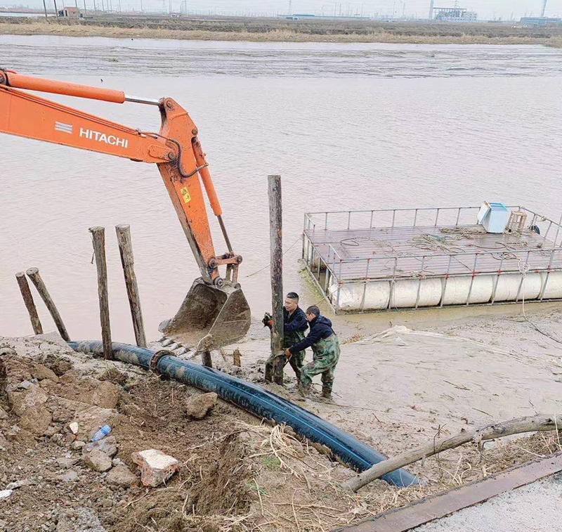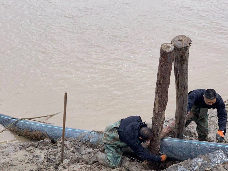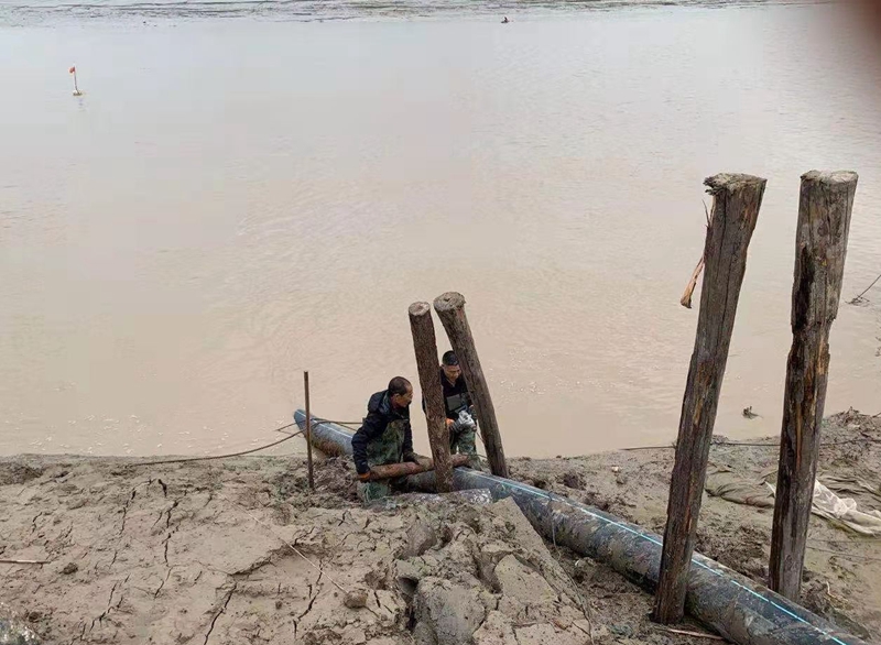 一想到昨天管道巡查到这里的情形,现在还让人“心有余悸”!因管道地处善后河弯道处,常年的泄洪冲刮将河边覆盖管道的泥土冲刷卷走,使得岸边泥土下原本穿越的PE315管道已经暴露出来,退潮时的旋流不断地冲撞着漂浮起来的钙液管道,剧烈抖动着的管道不时发出“噗噗的低吼”随时可能折断。埒子口潮河段是钙液东输灌西管道最长的一节过河穿越,全长约300米。穿越管道如果折断在河底后果将不可想象、经济损失也是不可估量的,这一幕让在场所有人员都为之捏了一把汗!