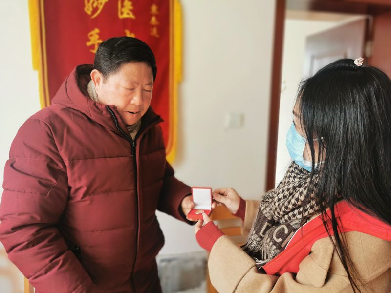 为老党员送上学雷锋纪念章