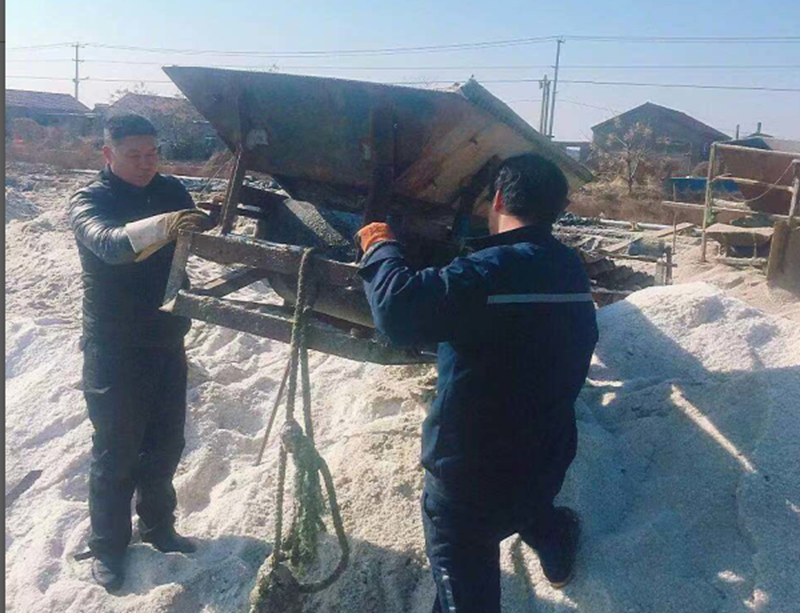 在海洲湾公司的海滨三组原盐集运现场,过河原盐皮带机滚笼上的钢筋因机械疲劳断裂造成无法运转。为了不影响原盐集运,接到通知后,机械班维修人员冒着刺骨严寒迅速携带电焊机等维修工具赶到现场。露天下,检查拆卸、焊接加固、安装调试一气呵成,很快机械又重新运转起来。