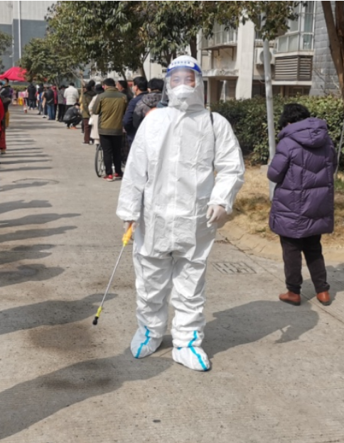 党员尹永明,穿好防护服,带上手套,口罩和防护眼镜,背上30多斤的便携式喷射器全身“武装”,变成“大白”开始了一天的工作,从早上7点开始“打起精神努力干”到下午1:30“拖着疲惫的双腿结束”。