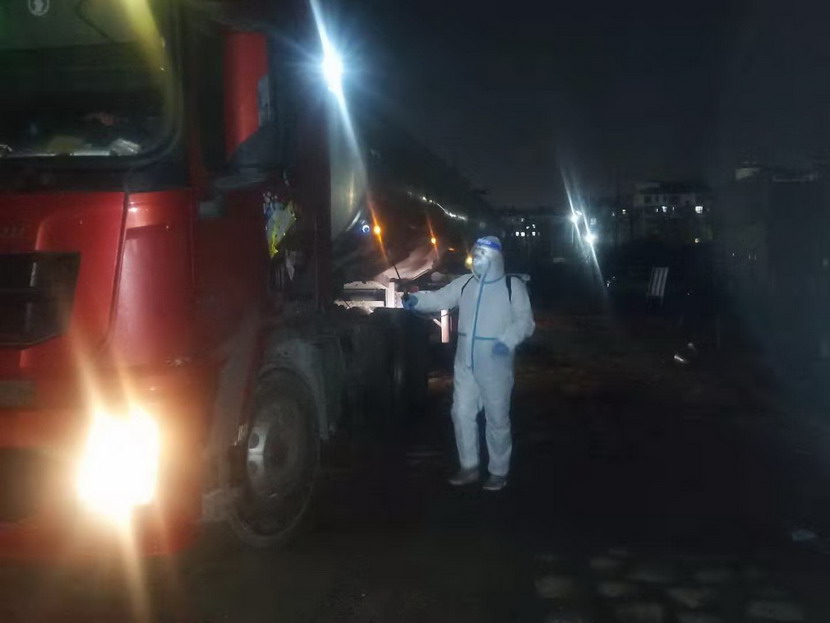 在登记信息的过程中,公司纪检专员孙健细心的发现驾驶人员的不对劲,“师傅,您看起来很疲惫,是身体不舒服吗?”“小伙子观察真是细致,我只是太饿了,闭环管理规定驾驶员不准离车,所以我从盐城出来4个多小时还没有吃晚饭。”“师傅,您稍等一下,我去给您买份快餐,再给您烧壶热水!”当驾驶员吃完快餐,钙液车也装货结束,此时已是晚上9点40分,按照“方案”规定,“大白”程辉对车辆进行离场消杀,并拍摄相应消杀照片,上传系统。
