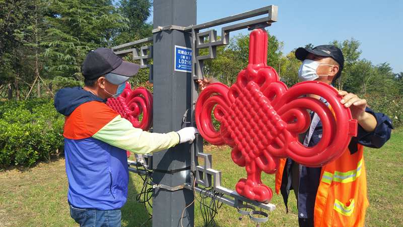 和往年一样,今年“中秋”“国庆”两节前夕,资源管理分公司组织公司精兵强将加入到翔立分公司两节前道路亮化景观突击行动中,该公司这些志愿者队员有的维修破损的中国结红灯笼等亮化灯,有些负责安装、运输,为在节前加快完成安装任务贡献了自己的力量。图为该公司志愿者在安装自贸区主干道上的“中国结”亮化路灯。