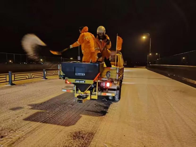 夜晚12点,在佟圩路马山立交,孙玉虎在工程车上一边抛撒融雪剂一边指挥:“融雪剂一定要撒布均匀,适当扩大距离,避免浪费。”工程班金华、苏志国、林军、李林不停地在风雪中挥舞着铁锨,丝毫顾不上被风雪击打的面部疼痛。