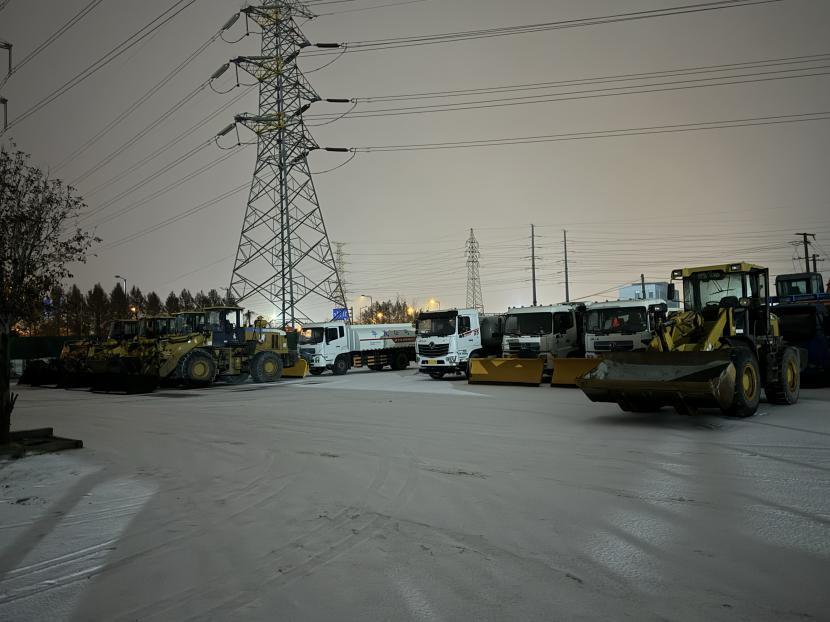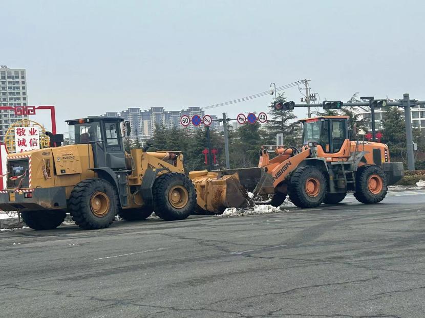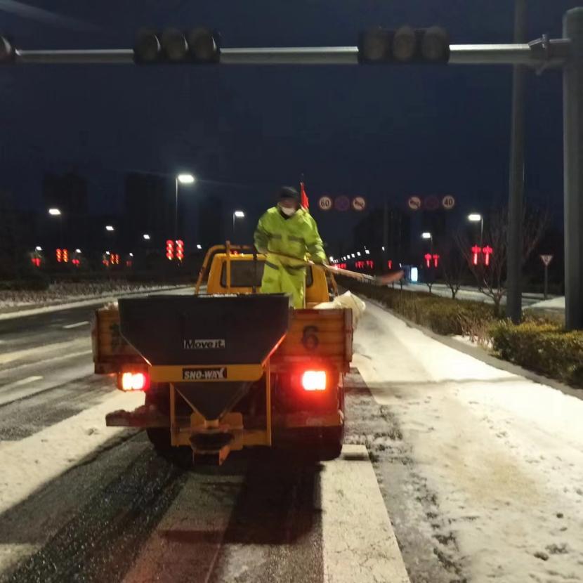一方有难,八方支援。由于本次降雪量大、势急、持久,单靠环卫分公司无法全面完成任务,在上级领导的统筹考虑下,兄弟单位火速驰援,大绿化、大市政、大采购,大的不仅是业务整合,更是人心凝聚,更是集思广益。翔立、盛达利用钙液和工程资源优势,通过架设大型原料桶储备钙液水,由3-5辆工具车进行24小时钙液抛洒,积冰融化速度超出预期,提升了后期铲车的工作效率,顺利保证了上下班高峰期交通顺畅。特别是在2月22日,在兄弟单位的协助下在清晨8点完成了活动路线保障及市领导扫雪除冰视察。