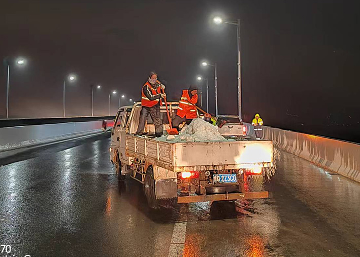 该公司迅速启动突发天气应急保障预案,近30余名道路应急排险突击队员,在公司统一按排下 ,装车备运融雪盐斤近15吨,现场工作中队员们士气高涨,无所畏惧。夜间8时左右,10余名党员先锋,兵分三路再次安全有序奔赴烧香河、海滨大道、228等路段桥梁,无惧大风夹着冰雨颗粒吹打脸颊,两人一对、三人一组、挥动手中铁铣,汗水与冰雨湿透橙色衣衫,经过近4个多小时努力奋战,人工撒放融雪盐斤近20余吨,高质高效保障近30座桥梁安全通畅。