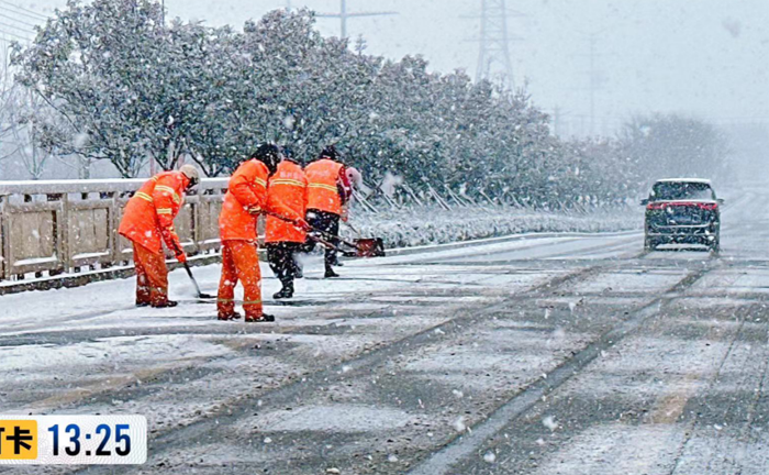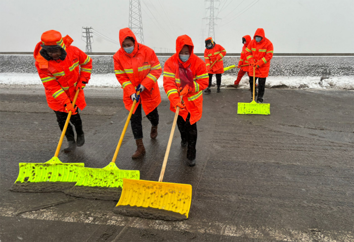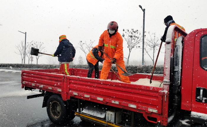 悦升公司按照责任分工,分包路段、分配任务,出动除雪机械设备,夜以继日、奋战一线,紧张有序地开展道路冰雪清除工作。本次出动保障人员160余名,兵分7路,2路装卸队负责将提前采购好的200多吨融雪剂有序装车,5路道路保障队负责各自区域内的冰雪清除。保障人员克服地面湿滑、气温骤降等不利因素,秉承“减存遏增”的理念,各路段按照人工+机械的方式,采取“边下雪边除雪”的工作模式,共出动2辆雪辊车、4辆大雪铲车、1台撒播机、运雪皮卡和厢货车共11辆,循环开展除雪作业,各组之间配合默契,大大提高了工作效率。